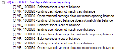 The Solutions Framework contains a number of validation rules tied to the initial hierarchies. Each validation rule targets a specific account under the symbol ACCOUNTS_ValRep