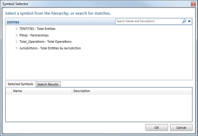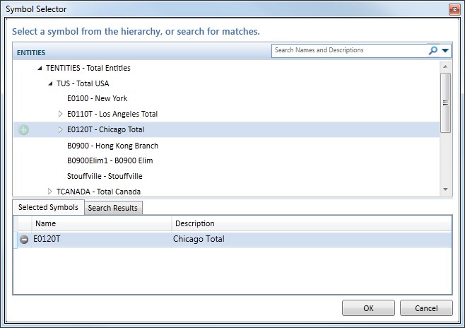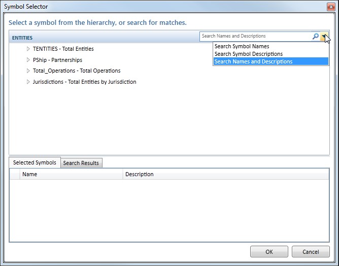 Note: After text is entered in the search field, the Symbol Selector automatically navigates to the first search result symbol in the hierarchy. As in the Selected Symbols tab, click a symbol in the Search Results list to automatically navigate to that symbol in the hierarchy.