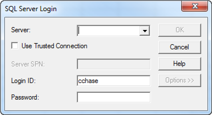 - Click Connect. The SQL Server Login dialog opens, as shown below: