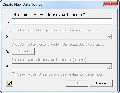 - Select <New Data Source> and click OK. The Create New Data Source dialog displays, shown below:
