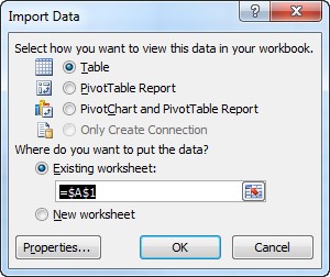 - Select Return Data to Microsoft Excel and click Finish. The Import Data dialog displays, as shown below: