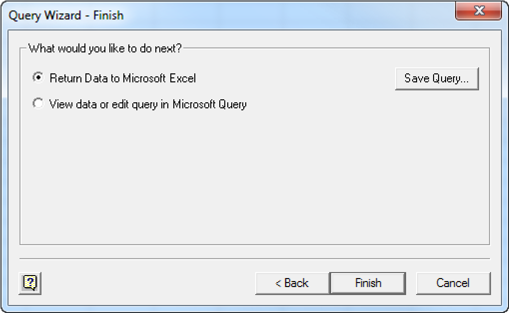 - Click Next. The Query Wizard - Finish dialog displays, as shown below: