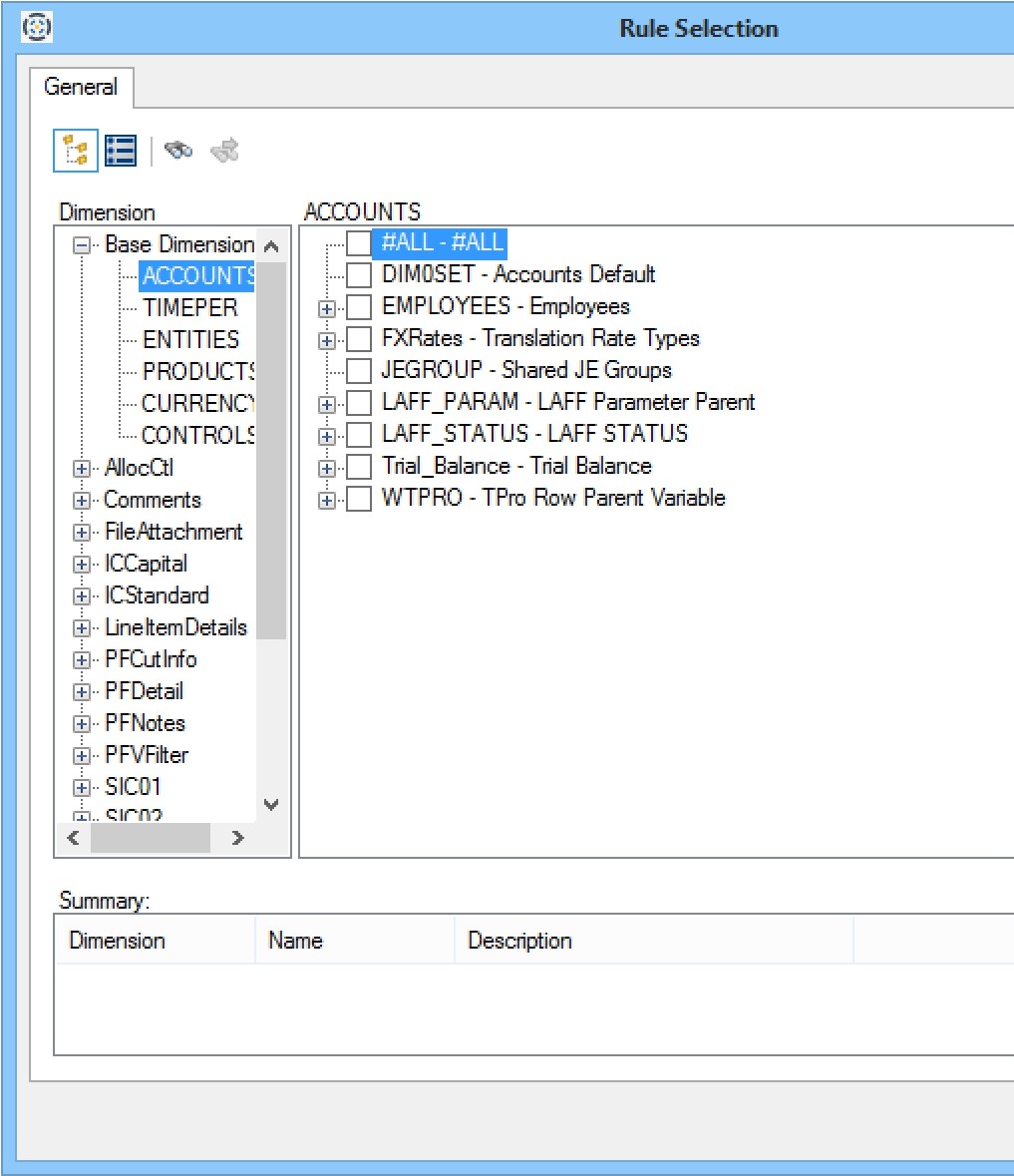 - To add symbols to the rule, click Insert. The Rule Selection dialog opens, allowing you to make selections from the dimensions list. Click OK when you are finished adding symbols.