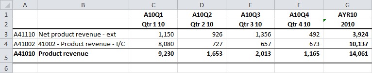 In the new data query, data displays for the two child symbols of A41010 (A41110 — Net product revenue - ext and A41002 — 41002 - Product revenue - I/C) and A41010 itself in the Row dimension.