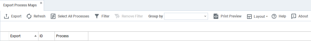 When the export process maps app is selected the user is shown a datatable listing the process maps in the system.
