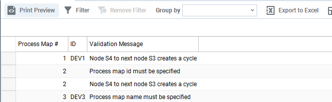 - If there are any validation errors, a table listing the errors will appear. No process maps are imported.