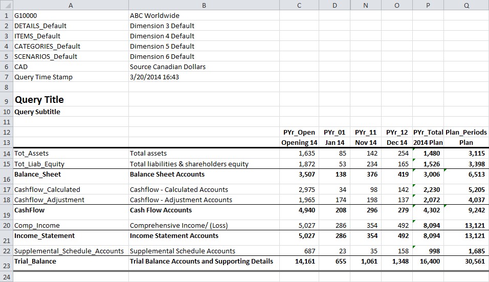 Note: In the following example, colored shading has been added to the data query results to better illustrate the separate sections. In addition, columns E to M have been hidden to display all relevant sections of the data query results.