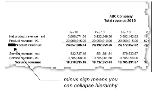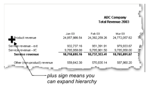 You can expand and collapse hierarchies in the down and across dimensions of a report by clicking the plus and minus signs beside parent symbols, as described in Changing the level of symbol detail.