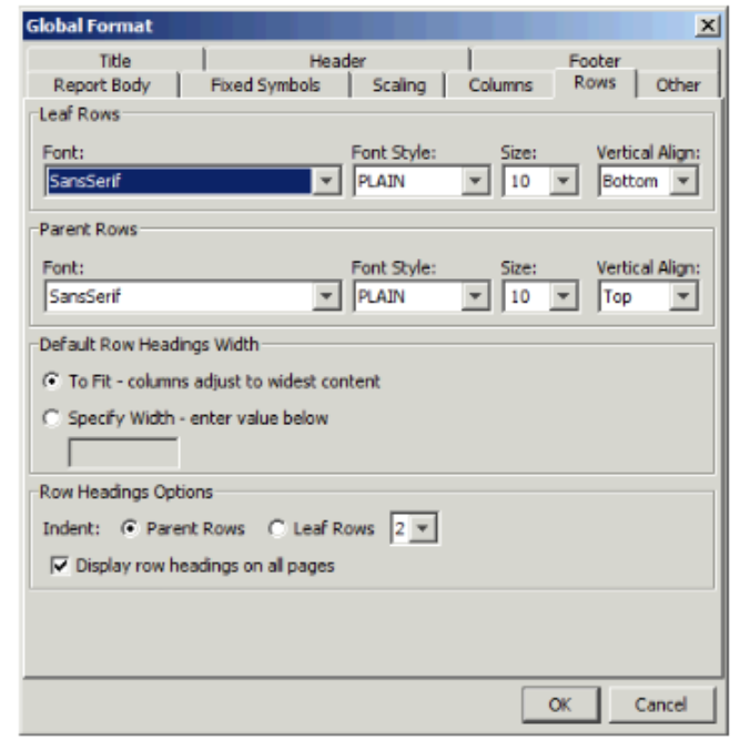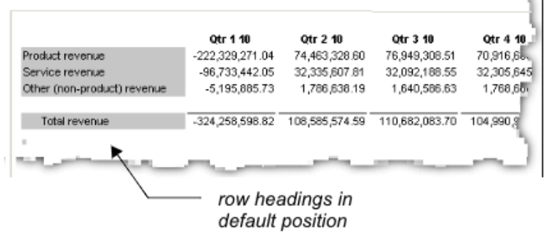 | row formats | You can change the row heading formats as well as the row heading widths in a report. |