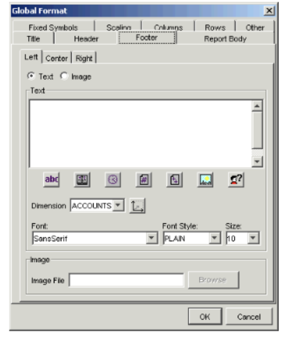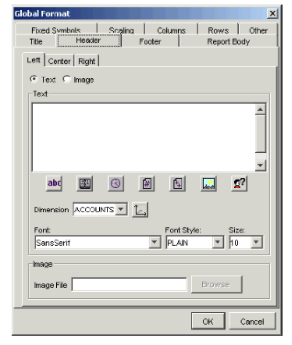 Icon Description To insert the schedule name, description, or both, into the report title. This option applies only if the report contains schedule information. To insert the date into the report title. To insert the time into the report title. To insert the page number into the report title. To insert the page number and total number of pages into the report title — for example, “2 of 10”. To insert the name of the template into the report title. To insert the current user’s full name into the report title. To insert a list of the report’s root symbols for a particular dimension into the report title. Make sure you select the appropriate dimension in the Dimension field. - You can insert attribute values into the title by inserting an attribute token. To insert an attribute token into the title, enter the following into the Text field: