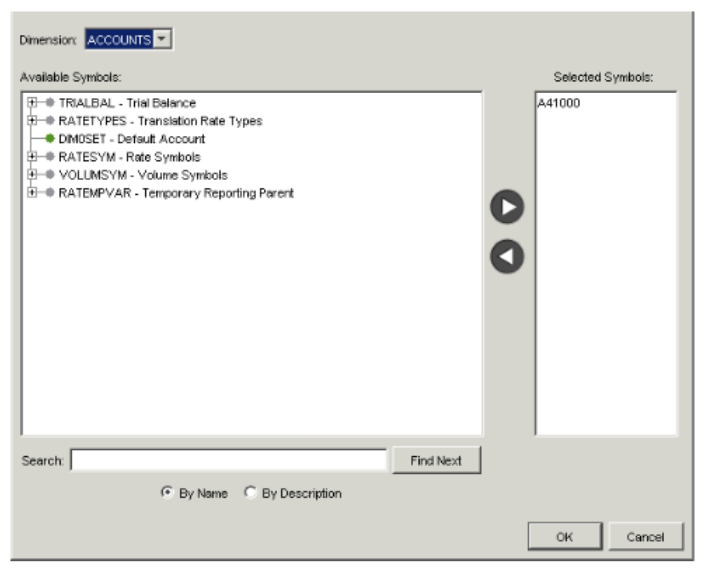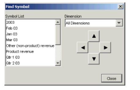 - In the report view, choose Go > Find Symbol. The Find Symbol dialog appears, showing a list of all symbols in the down dimension and across dimension of the report.