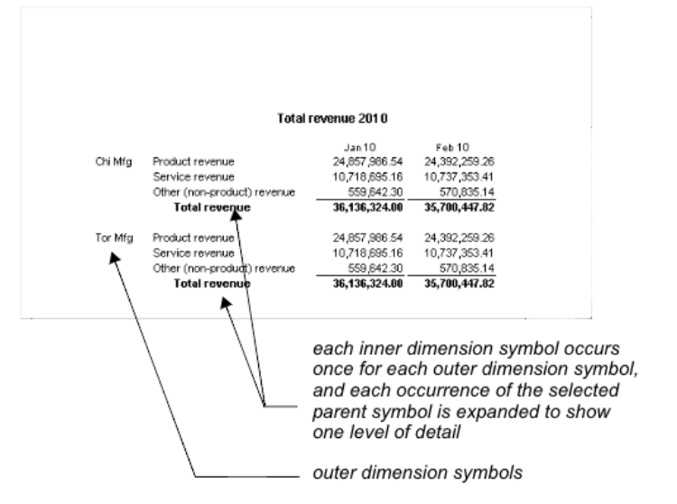 For example, if you have two outer dimension symbols, each inner dimension symbol occurs twice. You can expand each occurrence of the same parent symbol in the down or across dimensions to show one level of detail below the selected parent. For example:
