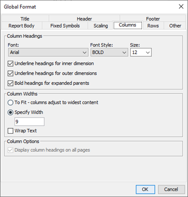 Field Description Use Global Width Select this option if you want to use the global width for columns. Specify Width To specify the width of the report columns as something other than the default. Enter the number of spaces in the field. Wrap Text If you want text to wrap to the width of columns, select this option.