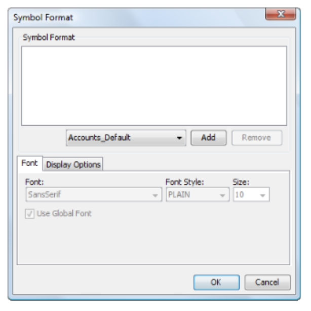 Field Description Before To insert the blank symbol before the symbol you selected in step 1, select this field. After To insert the blank symbol after the symbol you selected in step 1, select this field. - If you don’t want to use the global font, clear the Use Global Font field. The other Display Options fields become active.