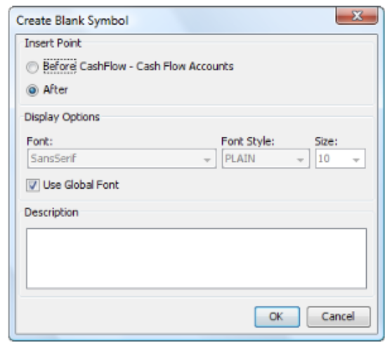 Font Select a font for the blank symbol description. Font Style Select a font style for the blank symbol description. Size Select a font size for the blank symbol description. Description If necessary, type a description for the blank symbol. This description is only shown in the report view.