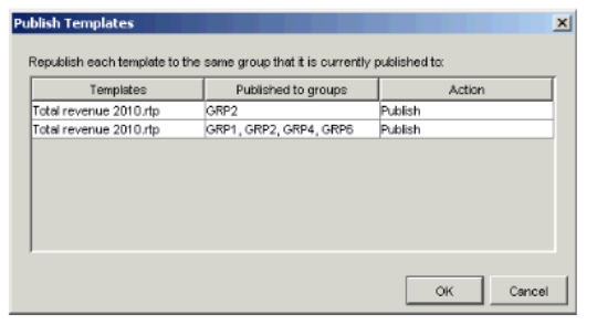 - If you selected more than one template in step 4, and those templates were originally published to different groups, the Publish Templates dialog appears listing the templates you selected, and the groups to which they were originally published.