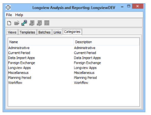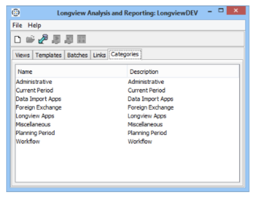 - Open the Longview Analysis and Reporting dialog, and click the Categories tab. A list of categories appears.
