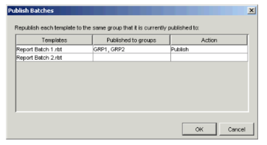 - If you selected more than one batch file in step 3, and those batches were originally published to different groups, the Publish Batches dialog appears listing the batches you selected, and the groups to which they were originally published.