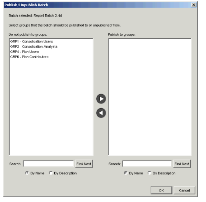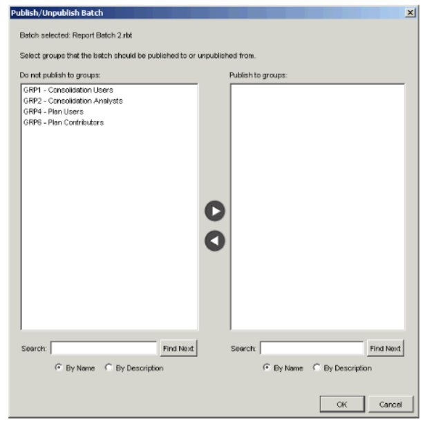 - In the Do not publish to groups field, select the groups to which you want to publish the batch, and move them to the Publish to groups field using the right arrow button. You can select more than one group at a time by holding down the Ctrl key while making your selections.