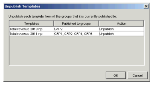 - If you selected more than one template in step 3, and those templates were originally published to different groups, the Unpublish Templates dialog appears listing the templates you selected, and the groups to which they were originally published.