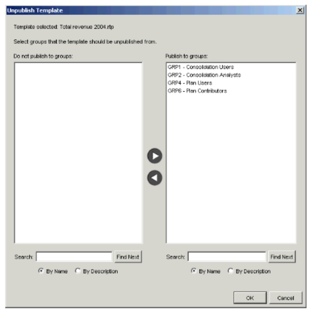 - In the Do not publish to groups field, select the groups to which you want to publish the template, and move them to the Publish to groups field using the right arrow button. You can select more than one group at a time by holding down the Ctrl key while making your selections.