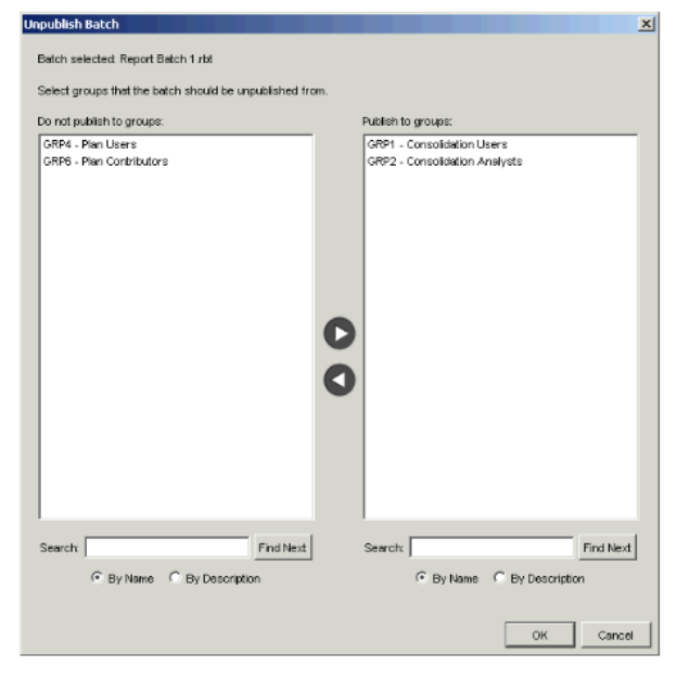 - If you selected only one batch file in step 3, or multiple batch files that were originally published to exactly the same groups, the Unpublish Batch dialog appears.