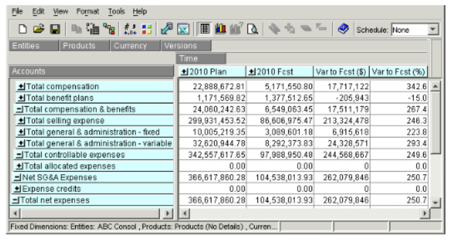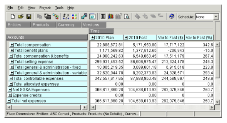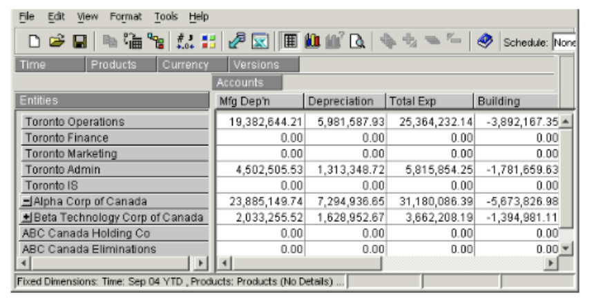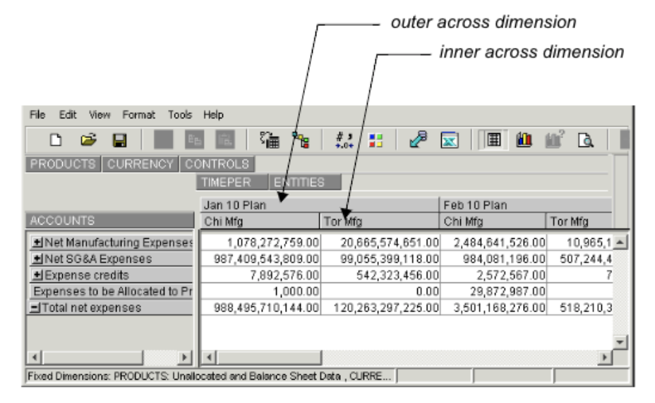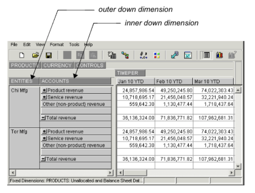 In Longview Analysis and Reporting, you have the option of including more than one dimension in either the down direction or across direction. For example, if you want to see data for multiple accounts in multiple entities, you may want to identify multiple dimensions for the down dimension.
