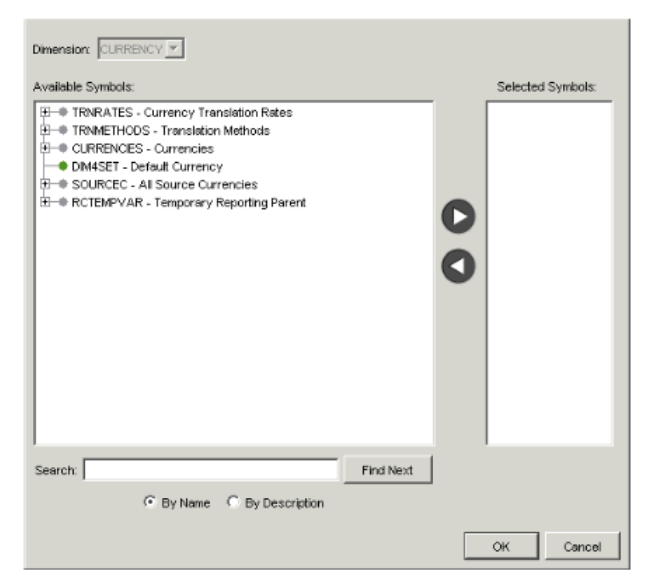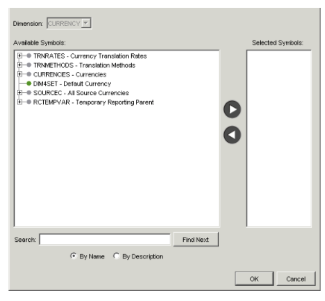 To search Do this Through the hierarchy Click on symbol names in the hierarchy to drill down to the appropriate symbol. Parent symbols that you can expand, and collapse are identified by a grey circle beside them. By name Start to type its name in the Search field. (You do not have to worry about case-sensitivity.) The application finds the first symbol whose name contains the letters you typed. To find the next occurrence, click Find Next. By description Select By Description and start to type its description in the Search field. (You do not have to worry about case-sensitivity.) The application finds the first symbol whose description contains the letters you typed. To find the next occurrence, click Find Next. - Click OK. If there are more dimensions for which symbols have not been selected, the Symbol Selection dialog reappears. Repeat step 3 to step 5 for each dimension you are prompted to select symbols for.