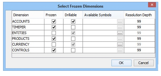 Field Description Frozen Select this field to specify that the dimension is frozen or clear this field to allow Report Users to select the symbols for this dimension in the template. Drillable If Frozen is cleared for this dimension, this field is automatically selected and cannot be cleared. Select this field to allow Report Users to drill into the symbol hierarchies in this dimension in the template. Available Symbols This field is available only if Frozen is cleared for this dimension. This field is unavailable for Schedule dimensions.