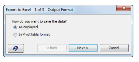 - In the view window, choose Tools > Export to Excel. The Export to Excel - 1 of 3 - Output Format dialog appears.