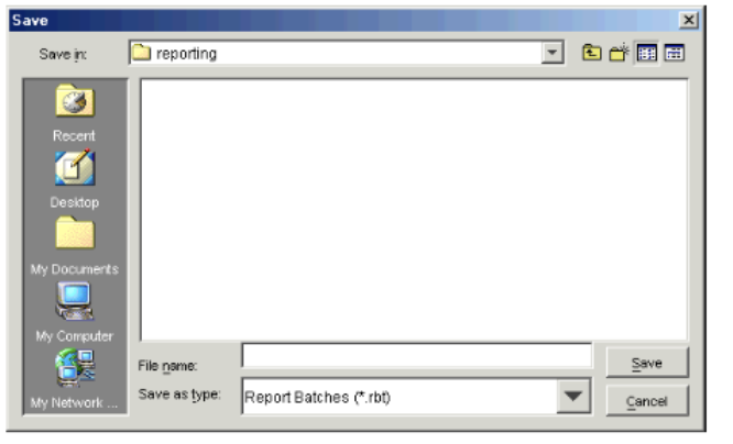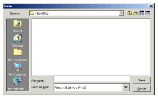 Field Description Look in If necessary, select the folder in which you want to save the batch. File Name Type a name for the batch. Files of type Select Report Batches (*.rbt). - Click Save. The Edit Report Batch dialog appears, with the name of the report batch in the title bar.