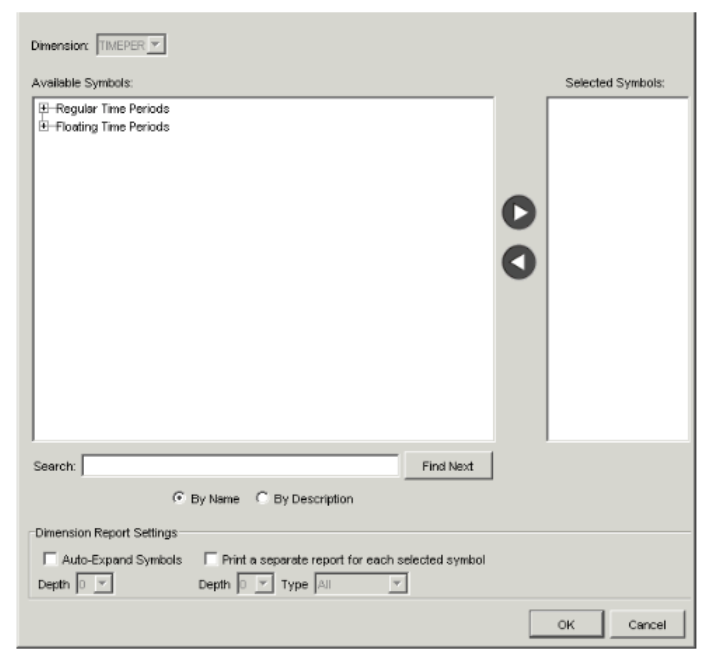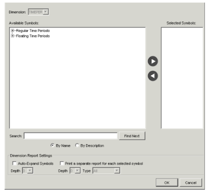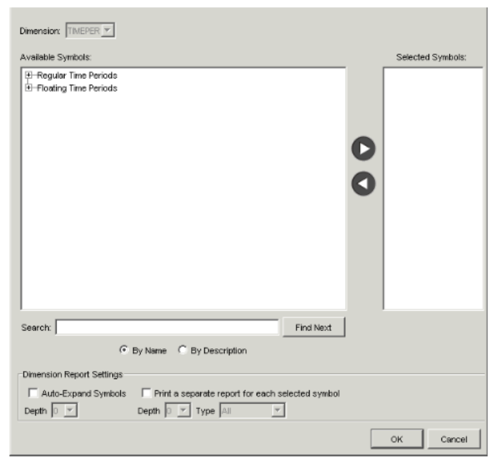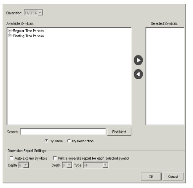 Field Description Available Symbols The available root symbols for the unfrozen dimension appear in this field. When you find a symbol to use as a root symbol for that dimension, highlight it, and click the right arrow button to move it to the Selected Symbols list. (If you know the name of a symbol, you can also type the name in the text field beside the Find Next button, and then click the button.) - Repeat step 6 for each root symbol you want to include in the report for that dimension.