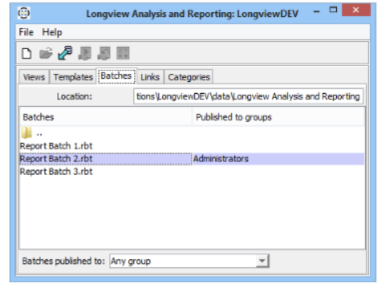 - Click the Close button in the top right corner. The Longview Analysis and Reporting dialog appears. If the report batch does not appear in the list, select Any group in the Templates Published to drop list.