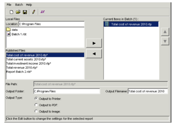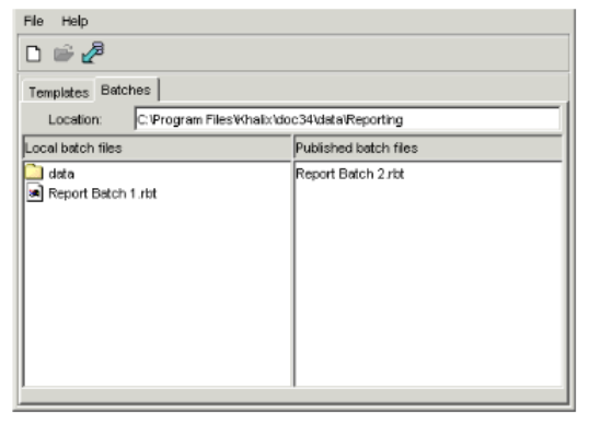- The Local batch files section lists the report batches you have saved locally. The Published batch files section lists the report batches the Report Publisher has published to the database. Select the report batch to which you want to add a batch and choose File > Open. The Edit Report Batch dialog appears.