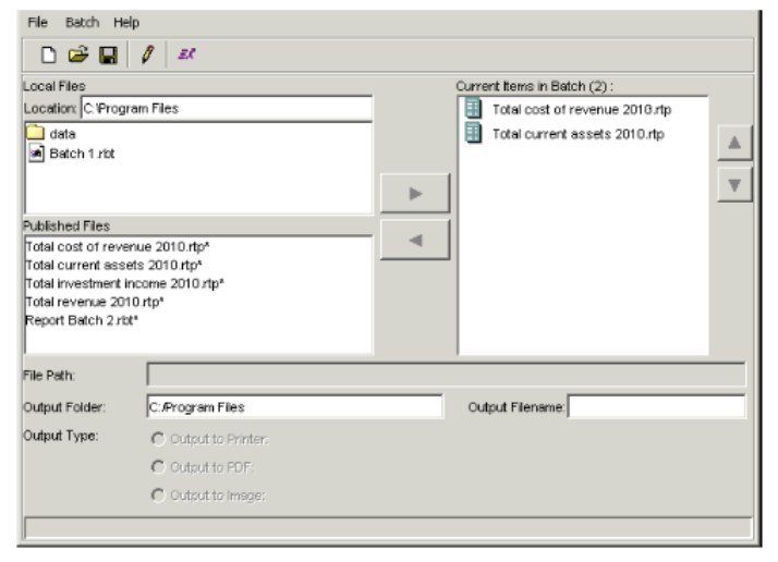 - The Local Files section lists batches you have saved locally. The Published Files section lists report templates and report batches the Report Publisher has published to the database. In either of these sections, select the batch you want to add, and click the right arrow button to move the batch to the Current Items in Batch field.