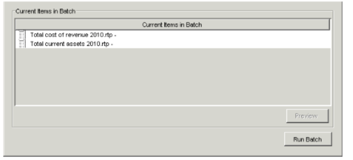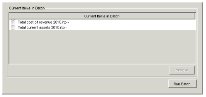 - To remove a report from the batch, select the report in the Current Items in Batch field, and click the left arrow button.