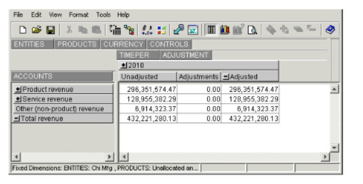 When the Show as Virtual Dimension field is selected, a virtual dimension called Adjustment appears in the dimension bar. The Adjustment dimension contains three symbols: Unadjusted (child), Adjustments (child), and Adjusted (parent of Unadjusted and Adjustments).