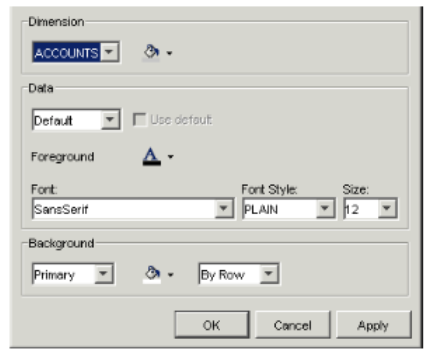 Data Description Default To specify the default color and font formats for all data in Longview Analysis and Reporting. Leaves To specify the color and font formats for leaf rows only. If there is more than one down dimension, the color applies to the leaf symbols in the inner down dimension only. Calculations To specify the color and font formats for calculated data. The color applies to calculated symbols in the down and across directions. Totals To specify the color and font formats for totals data (rows only). If there is more than one down dimension, the color applies to the parent symbols in the inner down dimension only. - Do one of the following:
