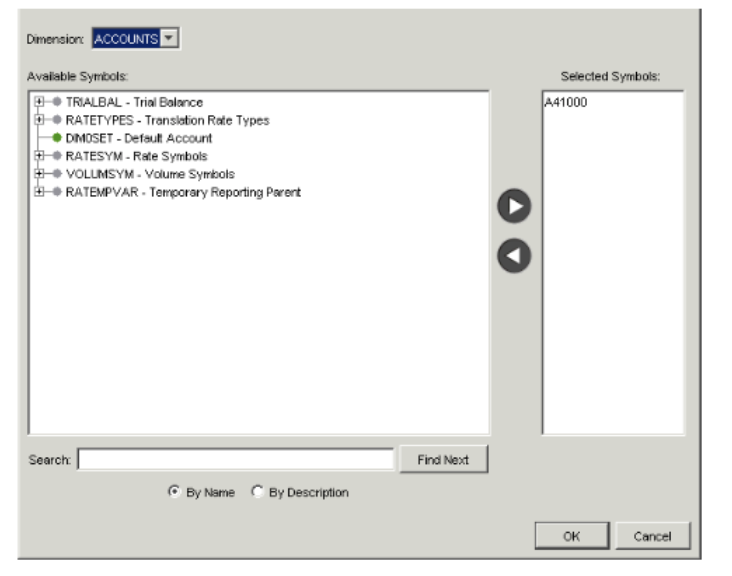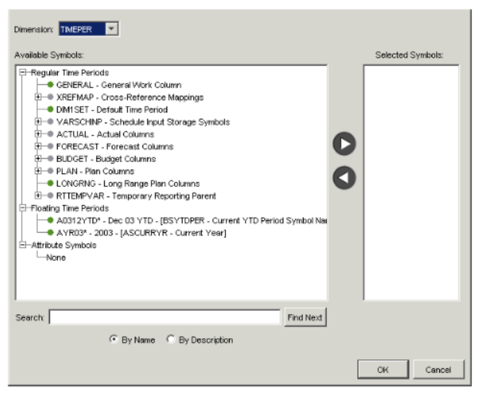 Field Description Available Symbols and Selected Symbols Find symbols in the Available Symbols list and click the arrow to move them to the Selected Symbols list. You may select as many symbols as necessary. If you want to prompt Report Users to select symbols for a particular dimension (for example, an entity) when they open the template, do not select a symbol for that dimension. You must remember however, to make sure users are allowed to select symbols for that dimension when you publish the template.