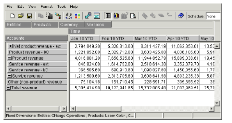 - In the view window, click and drag a dimension button to the box just above the down column. (Typically, you would select your ACCOUNTS dimension.) A small black arrow appears to indicate the correct position.