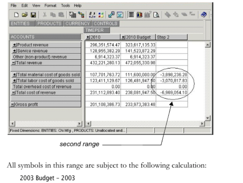 All child symbols beneath the selected parent symbol are included in the range and are thus subject to the same calculation. For example, in the previous example, the initial range is Gross profit and all its children.