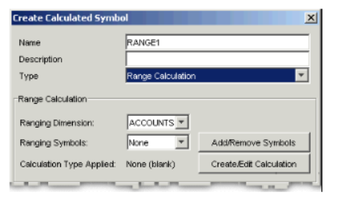 Field Description Available Symbols and Selected Symbols Find the symbols within which you want to define symbol ranges in the Available Symbols list and click the arrow to move them to the Selected Symbols list. You may select as many symbols as necessary. - Click OK. The Create Calculated Symbol dialog appears with the symbols you selected in the Ranging Symbols drop-down list.