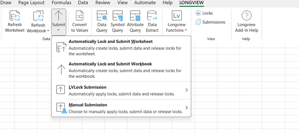 To apply and release locks in the Longview Add-In for Office, you must have Modify Data authorization. If you do not have Modify Data authorization, the Submit button is unavailable. In addition, to submit data in the Longview Add-In for Office, you must have Submit Data authorization for the Longview Add-In for Office. If you do not have Submit Data authorization, the Submit options are unavailable. These authorizations are set in Longview Application Administrator.