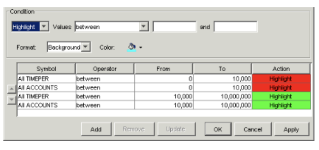 Note: Conditions are prioritized according to the order in which they appear in the list. For example, if the first condition shows numbers between 0 and 500 in red, and the second condition shows numbers between 0 and 1000 in blue, both red and blue conditions appear. However, if the first condition shows numbers between 0 and 1000 in blue, and the second condition shows numbers between 0 and 500 in red, only the blue condition appears, as it has priority over the second condition in the list. To change the priority, select a condition in the list, and then move it either up or down using the arrow keys to the left of the list.