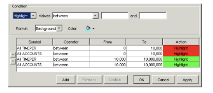Values Specify the condition you want to apply to the data. For example, you can choose to have values between 0 and 10,000,000 highlighted, filtered, or suppressed. - Highlight: To highlight the cells containing data meeting the condition.
