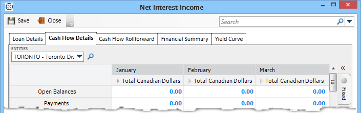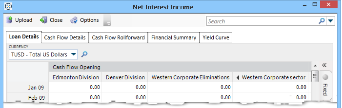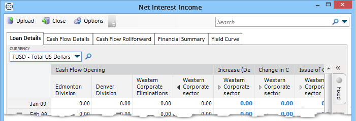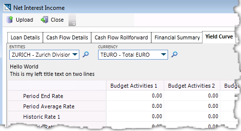 Use this function to specify the dimensions that are available in your Data Grid as slice dimensions. Slice dimensions are dimensions that users can change the symbol selection for using the Slice list in the top left corner of the Data Grid. For example, in the Data Grid below, the Slice lists contain Entities and Currency, and the TORONTO - Toronto Division and TCAD - Total Canadian Dollars symbols are the default selections.