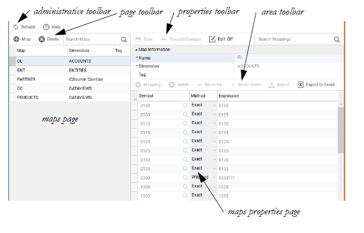 Users with the appropriate permissions can create, view, and modify maps and mappings to maintain system data. A map is a collection of mappings for a specified dimension. A mapping is a rule for translating an account code or other code in your source file to a Longview symbol name when importing data into the Longview database.