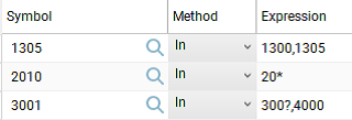 Use this method to match the expression value to one of several values. For example, use the IN method when you have a set of source symbol names to import to a Longview database symbol name. This method is case sensitive. You may also use the wildcard characters question mark (?) and asterisk (*) in the IN clause.