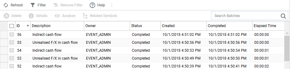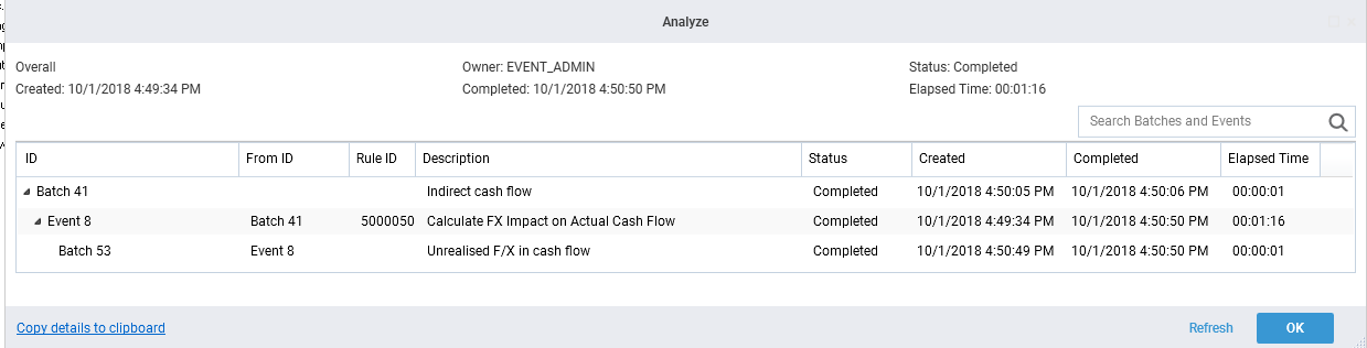 To refresh the processes list at any time, click Refresh. This updates the list to reflect the status of all batches and events triggered by the overall batch, and the completion date, time, and elapsed time if the batch or event is now completed.