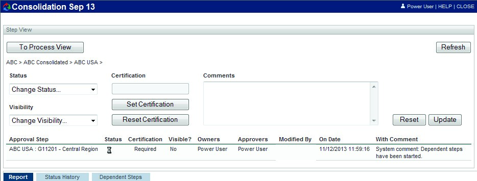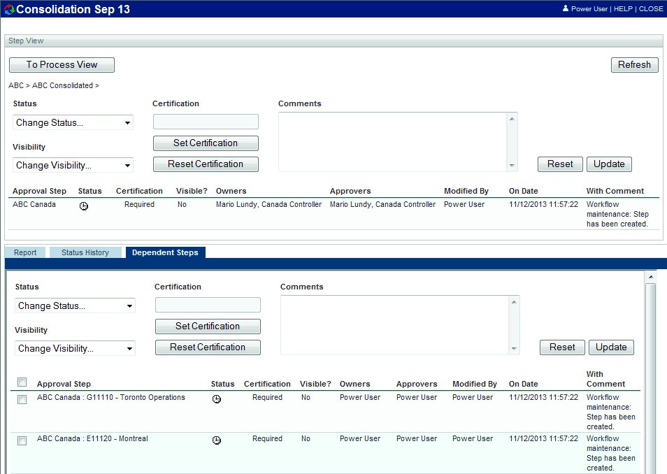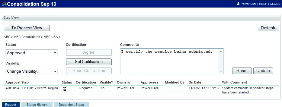 - If you are working on a hierarchical approval step, you can also certify the data of multiple dependent steps simultaneously. To do so, click the Dependent Steps tab.